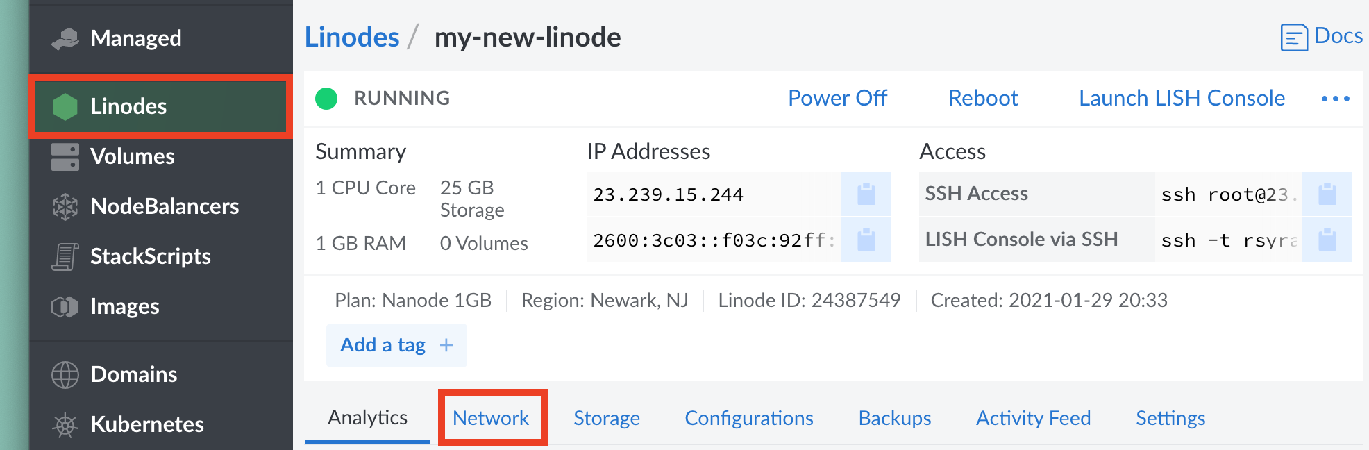 To find the networking information for each of your Linodes in your Linode Manager, click on the Linodes tab to the left of the page, select the Linode you’ll be configuring, then click on the Networking towards the top.