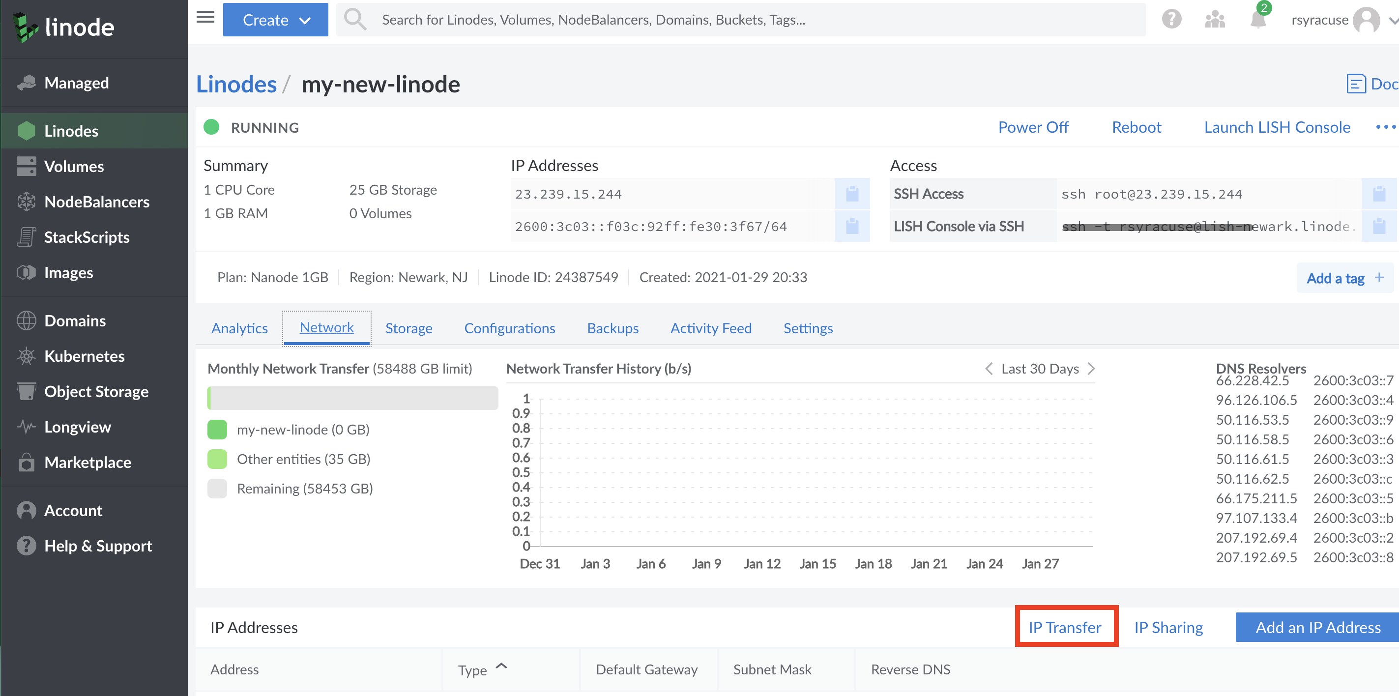 If you have two Linodes in the same data center, you can use the IP transfer feature to swap their IP addresses. This could be useful in several situations. For example, if you’ve built a new server to replace an old one, you could swap IP addresses instead of updating the DNS records.