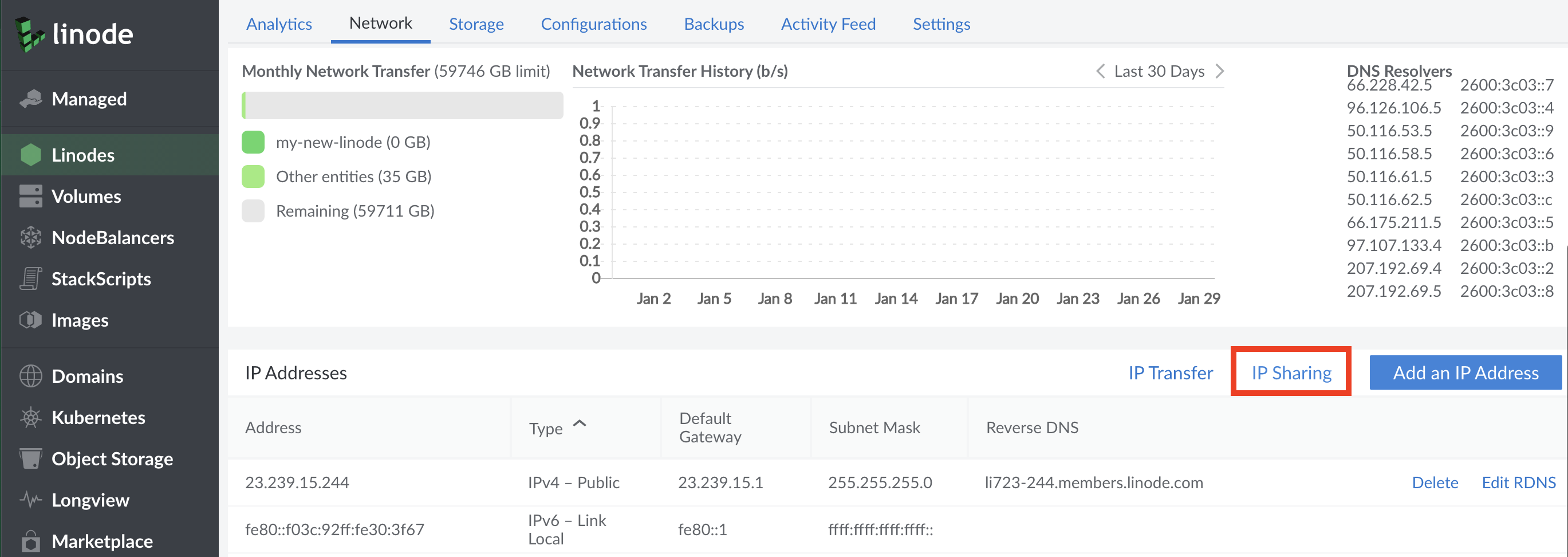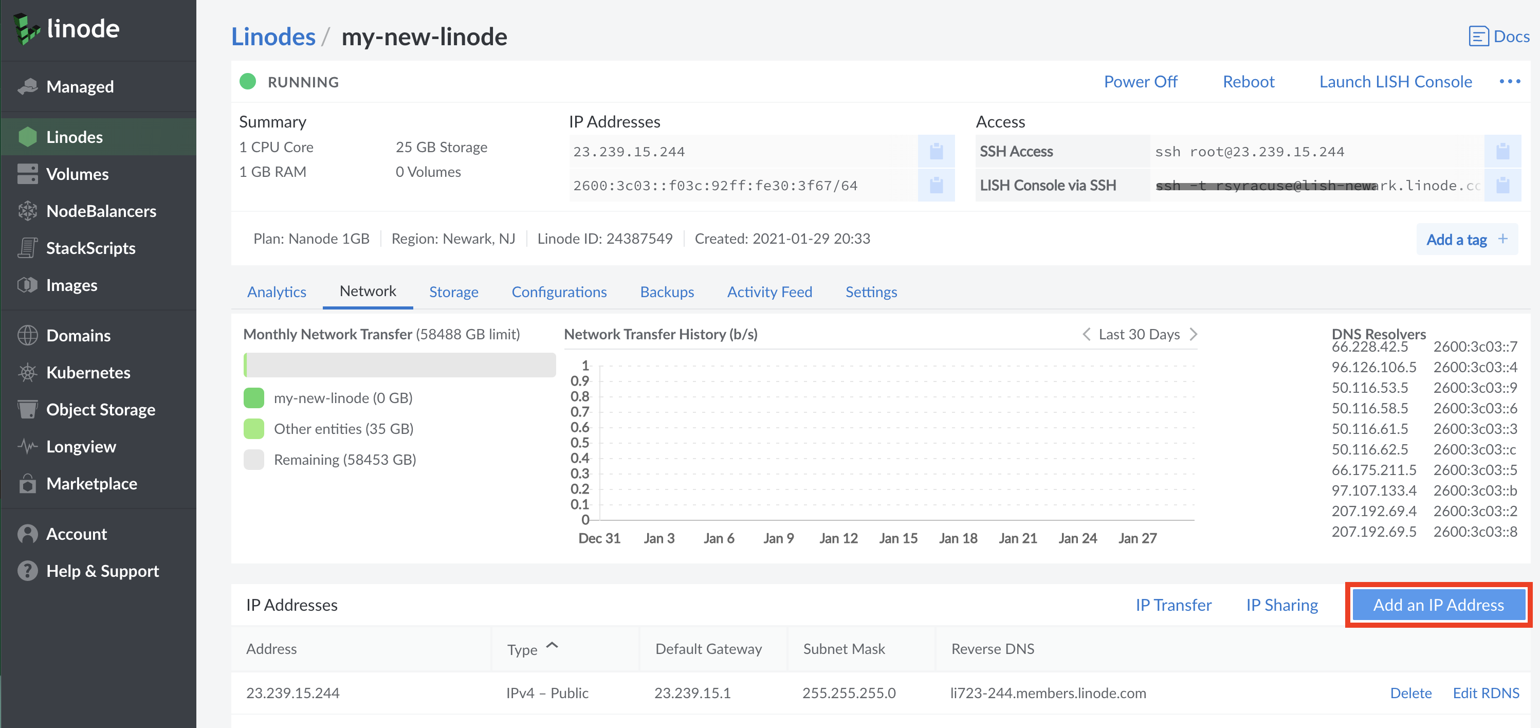 The Networking tab of the Linode detail page in the Cloud Manager contains important network settings for your Linode. Use this tab to find your IP address, set the reverse DNS, configure IP sharing (called IP failover in the Classic Manager), and swap IP addresses with another Linode. You can also access the Linode Shell (Lish) console to remotely connect to your Linode and troubleshoot problems.