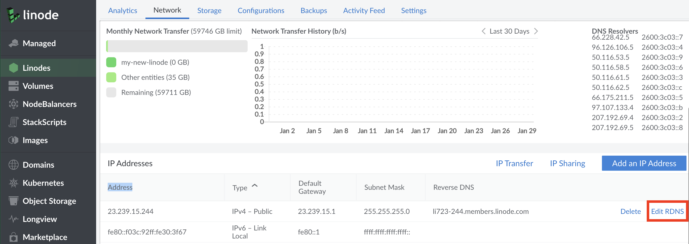 Click Save. You will be taken back to the Linode’s detail page where you can verify the reverse DNS entry under the Reverse DNS column.