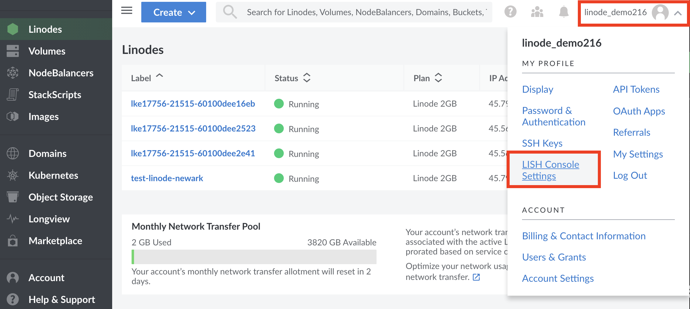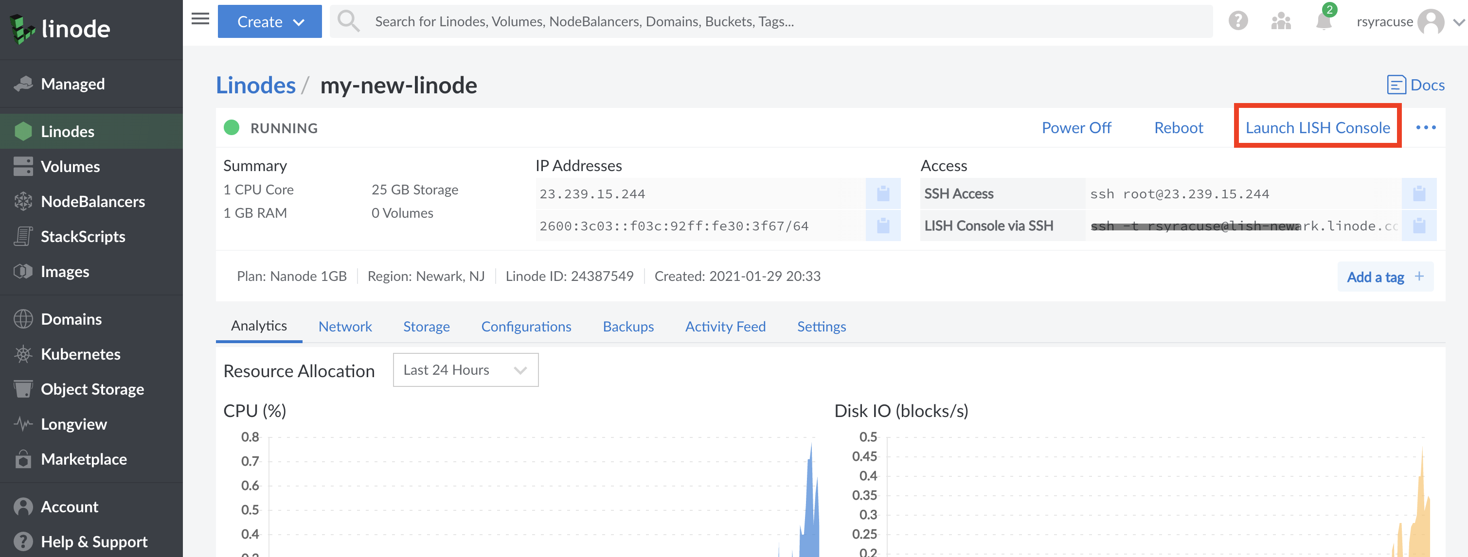 The Lish console allows you to access your Linode at any time, even if you’ve messed up your network settings. To access Lish, use the Lish console or an SSH client application installed on your computer. For more information about Lish, including usage tips, see Using the Linode Shell.